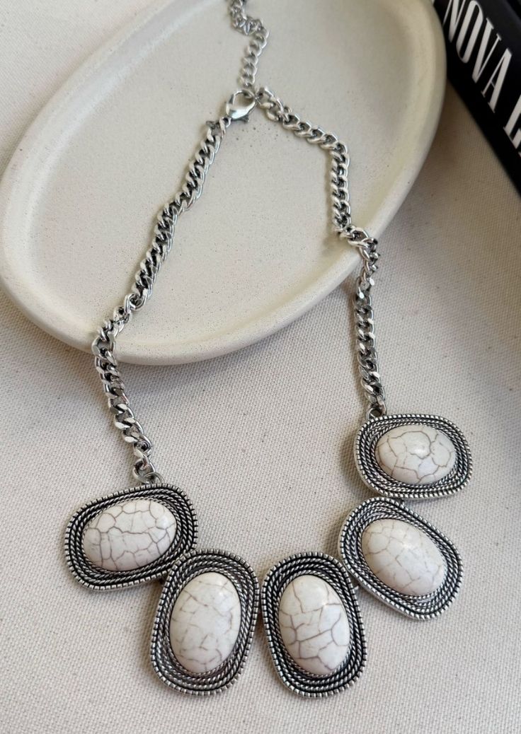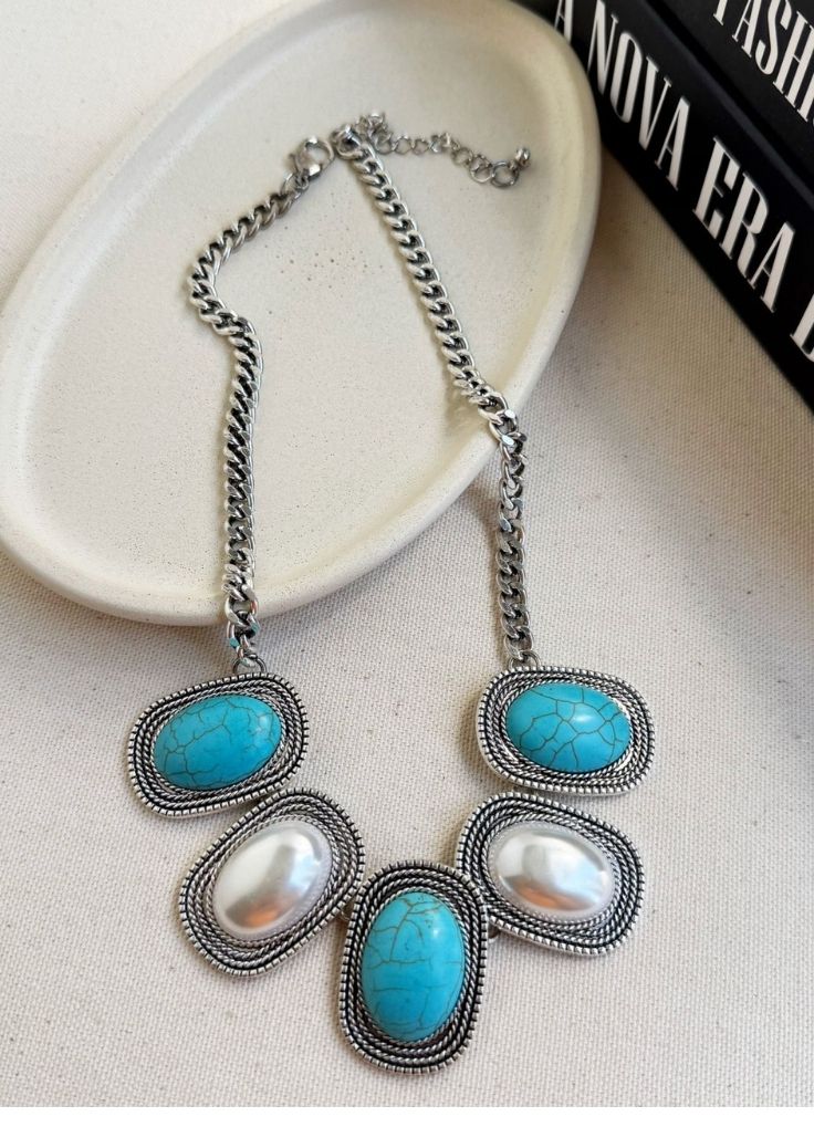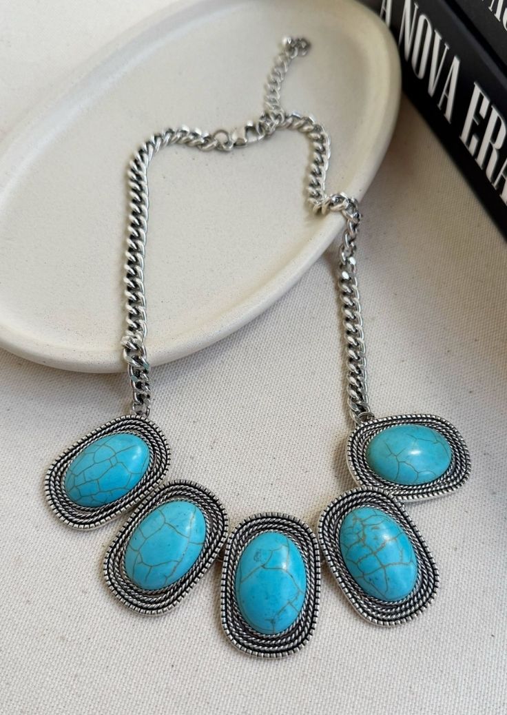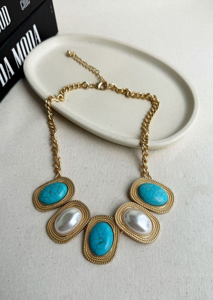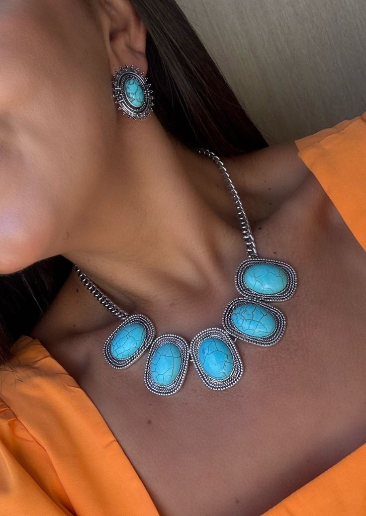 Cada colar traz pingentes geométricos com aplicação de pedra inspirada na turquesa natural, cuidadosamente lapidados para refletir harmonia e força. A corrente média com elos firmes e acabamento em dourado ou prateado vintage garante presença e versatilidade — perfeita para acompanhar você em qualquer ocasião.